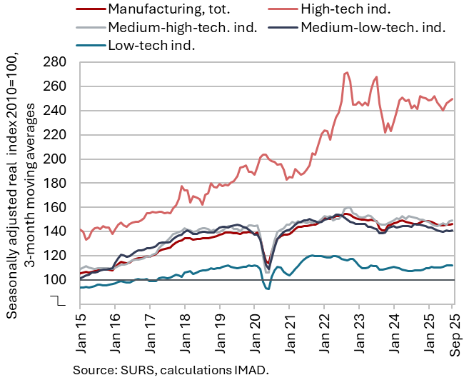 After contracting in the first half of the year, manufacturing output increased slightly in the third quarter (seasonally adjusted), and after declining in the first half of the year, it remained largely unchanged year-on-year. In the third quarter, output increased across all groups of industries by technological intensity (seasonally adjusted). Year-on-year, output in high-technology and low-technology industries remained higher, and in the first nine months it also exceeded the levels recorded a year earlier. However, output in medium-high-technology and medium-low-technology industries remained lower year-on-year in the third quarter as well; in the first nine months, it declined by an average of around 2.5% year-on-year. Output in the manufacture of motor vehicles and other transport equipment was one tenth lower than in the first nine months of last year, while it fell by around 5% in the metal industry. Only in the chemical and rubber industries and in the repair and installation of machinery and equipment was the production slightly higher year-on-year. Manufacturing output in the first nine months was, on average, 1.0% lower than a year earlier (working-day adjusted).