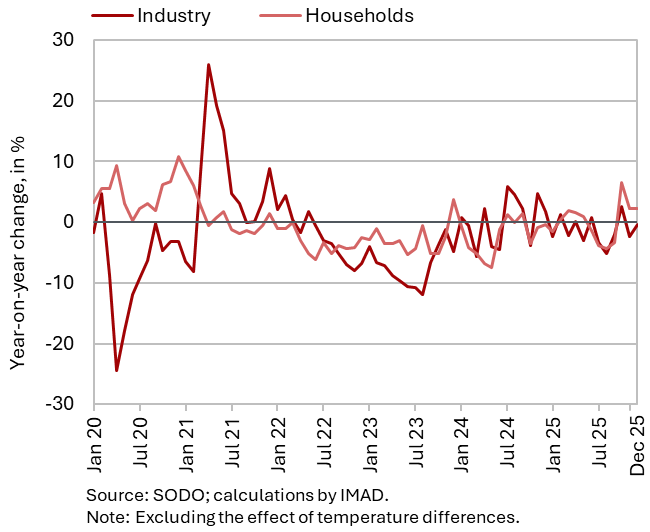 The December data indicate a year-on-year decrease in industrial electricity consumption. Despite one working day more in December 2025, electricity consumption was 0.4% lower than in December 2024. By contrast, household electricity consumption increased by 2.2% year-on-year.