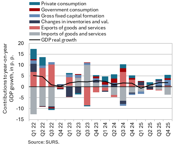 GDP grew by 1.1% last year, with growth primarily driven by construction investment. Growth in private consumption more than halved, while growth in government consumption also moderated. The contribution of external trade balance was negative. According to the Statistical Register of Employment (SRDAP), the number of persons in employment declined by 0.3% last year, with the most pronounced contractions recorded in administrative and support service activities, manufacturing, and construction. Employment increased only in public service activities. At the end of the year, the average gross wage per employee declined year-on-year due to a decrease in the private sector, which is associated with lower extra payments following the introduction of the mandatory winter bonus. In 2025, the overall average gross wage was 3.4% higher in real terms (5.9% in nominal terms); growth was stronger in the general government sector due to the beginning of the implementation of the agreed reform of the public sector wage system.