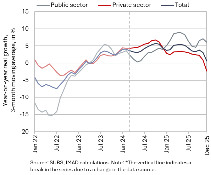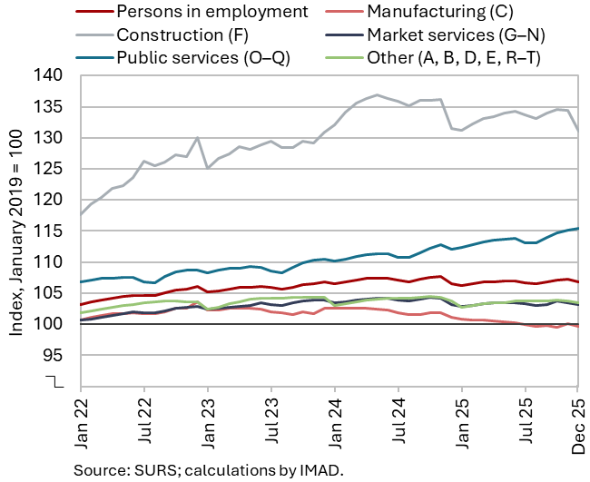 The number of persons in employment according to SRDAP declined slightly in December compared with the preceding months (seasonally adjusted), while increasing by 0.3% year-on-year. The year-on-year increase was largely attributable to a lower base in December 2024, which, inter alia, reflected a surge in retirements. On average in 2025, the total number of persons in employment decreased by 0.3% , primarily due to a decline in the number of employed Slovenian nationals (–0.7%) By contrast, the number of employed foreign nationals increased by 1.9%. The sharpest decline in the number of persons in employment was recorded in administrative and support service activities (–3.7%), mainly due to a decrease in employment agencies, followed by manufacturing (–1.8%), and construction (–1.4%). Conversely, employment expanded in public service activities, most notably in human health and social work activities (3.4%).
