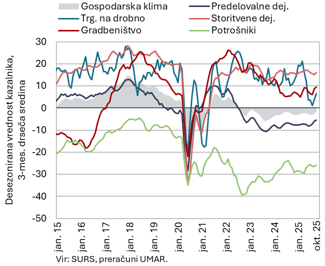 The economic sentiment indicator continued to improve in October and was again also higher year-on-year. Its value has been rising steadily since mid-year, with the confidence strengthening across all activities. Consumer confidence, however, remained roughly unchanged after improving in August. With the exception of manufacturing, where the confidence indicator has been improving only gradually, its value has exceeded the long-term average in all other activities (construction, trade, and services). The consumer confidence indicator remains slightly below its long-term average, showing no notable improvement since mid-year.