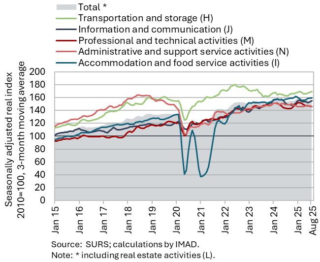 Total real turnover in market services, which had declined in the second quarter and continued to decrease in July, rose sharply in August (by 2.7%, seasonally adjusted), while remaining broadly unchanged year-on-year. Turnover increased significantly in current terms in transportation and storage (particularly in storage) where growth has been sustained over a prolonged period. Growth was also relatively strong in professional and technical activities, following a sharp decline in turnover in the second quarter and in July. In information and communication, modest growth continued in August after an increase in the first half of the year. After an increase in the second quarter and a decline in July, turnover in accommodation and food service activities also rose slightly in August. Turnover decreased only in administrative and support service activities, mainly due to a continued contraction in employment services. In the first eight months of 2025, real turnover was higher year-on-year only in transportation and storage (by 2.3%) and in professional and technical activities (by 0.9%).