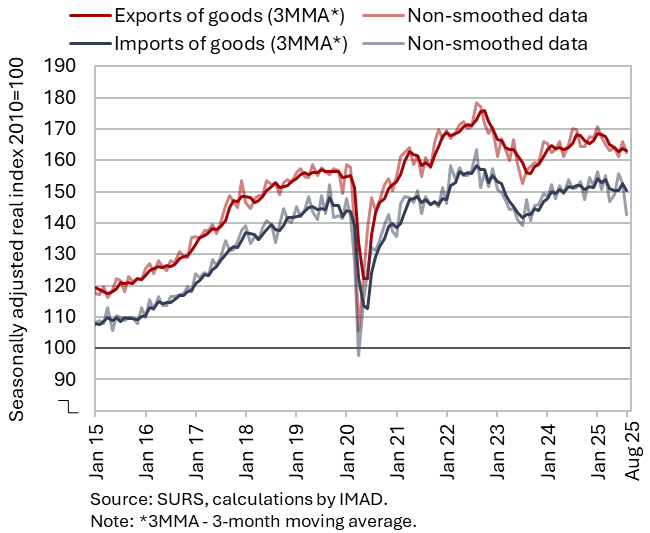 Goods exports and imports declined month-on-month in August and were lower than a year earlier; SURS made a significant downward revision to goods imports for the first seven months of the year, which also affects the balance of goods transactions. After growing in July, real exports fell by 2.0% month-on-month in August. Exports to both EU countries (particularly Italy) and non-EU countries decreased. Exports of metals and metal products, machinery and equipment, and various manufactured goods declined, while exports of pharmaceutical and other chemical products as well as vehicles increased further. Imports fell for the second consecutive month (by -6.6%), with declines seen in imports from both EU and non-EU countries. Imports of consumer goods fell sharply (all seasonally adjusted).