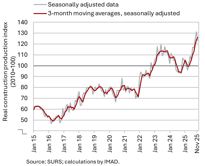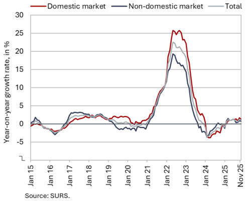 Slovenian goods exports in the first eleven months of 2025 were slightly lower than a year earlier, while activity in construction and household consumption increased over the first ten months. Real goods exports increased month-on-month in November for the second consecutive month, while imports declined. In the first eleven months of 2025, goods exports were 0.2% lower than in the same period of 2024, while imports were 1.6% higher. The decline in exports was mainly driven by lower exports of vehicles and other machinery and equipment, as well as iron and steel and some other materials (rubber products, mineral products, paper). Manufacturing output increased slightly month-on-month in November. Over the first eleven months, it remained lower year-on-year; among major activities, the year-on-year decline was largest in the manufacture of motor vehicles, trailers, semi-trailers and other transport equipment and in the metal industry. Following a decline in the first quarter of 2025, growth in the value of construction put in place strengthened markedly from the second quarter onwards; over the first ten months it was one tenth higher year-on-year. Real turnover in most trade segments increased in October following a decline in the third quarter; over first ten months of 2025, sales in all trade segments increased year-on-year. Real turnover in market services declined sharply in October after strong growth in the third quarter; in the first ten months of 2025, it was lower year-on-year only in administrative and support service activities.