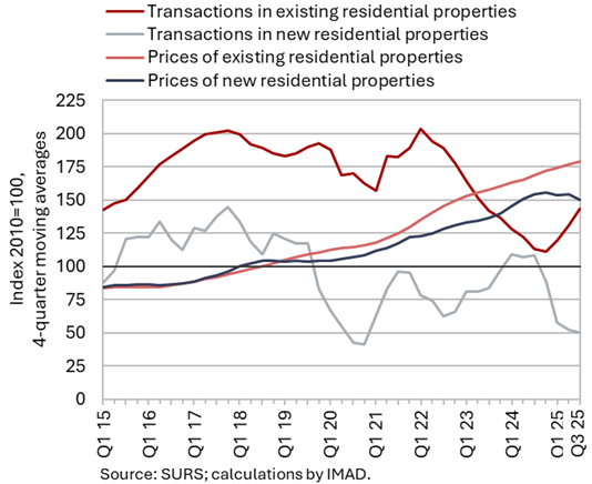 The year-on-year growth in dwelling prices halved to 2.7% in the third quarter of 2025. This slowdown was primarily driven by a year-on-year decline in the prices of newly built dwellings (-9.5%), while year-on-year growth in the prices of existing dwellings remained broadly unchanged from the first two quarters (5.2%). Following a pronounced decline over the period 2022–2024, the number of transactions of existing dwellings was more than half higher year-on-year. Sales of newly built dwellings were lower year-on-year (by 12.4%), although they accounted for only a small share of total sales (5%). After a pronounced increase in the previous quarter, their prices declined significantly in the third quarter and were similar to those recorded two years earlier.