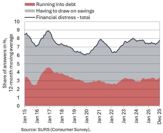 In the fourth quarter of 2025, the situation of households facing financial distress deteriorated both quarter-on-quarter and year-on-year, with a marginal improvement observed only among households in the lowest income quartile. The share of households from the first income quartile facing financial distress decreased by 0.3 p.p. quarter-on-quarter and by 0.7 p.p. year-on-year, reaching 13.2%. By contrast, the financial situation of households in the second and third income quartiles deteriorated. The share of households facing financial distress in these groups increased by 2.6 p.p. year-on-year, reaching 10.5% and 8.0%, respectively. Among households facing financial distress, the proportion of those running into debt was slightly higher year-on-year, while the share of those having to draw on savings to meet their needs remained broadly unchanged.