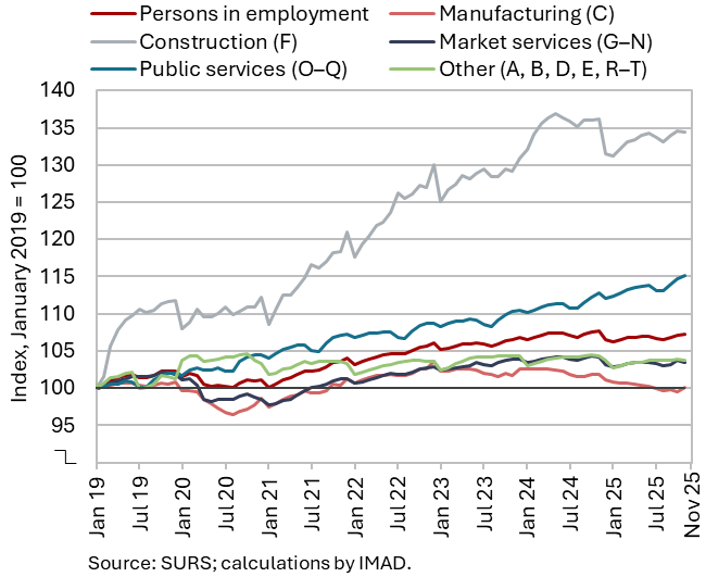 The number of persons in employment remained similar in November to previous months (seasonally adjusted) and was 0.4% lower year-on-year. The number of employees declined year-on-year (–0.6%), while the number of self-employed increased (1.3%). The sharpest year-on-year decline in the number of persons in employment was recorded in administrative and support service activities (– 2.1%), mainly due to a decrease in employment agencies, followed by manufacturing (–1.8%), and information and communication (–1.3%). The number of persons in employment continued to increase on a year-on-year basis in public service activities, particularly in human health and social work activities (up 3.4%). The number of foreign citizens in employment increased by 1.5% year-on-year in November, while the number of Slovenian nationals in employment declined by 0.7%.