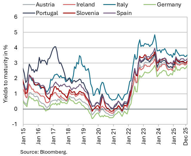 The yield to maturity on Slovenian government bonds declined by 4 basis points in the fourth quarter of 2025, to 3.05%. The spread to the German bond narrowed by 6 basis points (to 33 basis points), the lowest level since 2007. In the absence of inflationary pressures in the fourth quarter of last year, the ECB did not change its key interest rates.