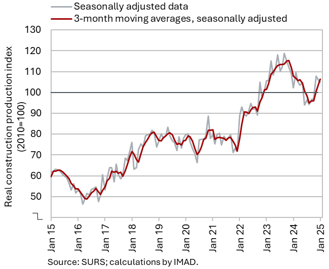 Short-term indicators of economic activity in Slovenia indicate weak activity growth in January and February; activity increased month-on-month mainly in trade sectors; compared to the same period last year, exports, turnover in trade and construction were higher, while manufacturing output and turnover in market services were lower. Real exports and imports of goods, which have fluctuated significantly in recent months, declined month-on-month in February. However, both remained higher year-on-year in the first two months (exports increased by 2.0% and imports by 1.2%). Manufacturing production, which had been gradually recovering since the end of the third quarter of last year, contracted in February (-1.8%, seasonally adjusted) and was, on average, also slightly lower year-on-year in the first two months (-0.7%). In a very uncertain international economic environment, sentiment in manufacturing is not improving. After a decrease in wholesale trade and retail sales of non-food products, as well as modest growth in the sales of motor vehicles and retail sales of food products in the fourth quarter of last year, real turnover rebounded sharply in January across all trade sectors. It was also higher compared to January 2024, with the most notable increase in the sales of motor vehicles. After rising in the fourth quarter of last year, total real turnover in market services declined in January due to a downturn in most activities and was also lower year-on-year. After robust growth in November last year, construction activity slightly decreased in December and January. However, due to the low base in January 2024, activity was higher year-on-year this January, marking the first increase in a long time.