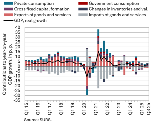 The Slovenian economy continued to expand in the third quarter of this year. GDP rose by 0.8% quarter-on-quarter (seasonally adjusted) and by 1.7% year-on-year. Year-on-year growth in private consumption eased slightly (1%), yet it remained an important driver of this year’s growth. Gross fixed capital formation increased markedly year-on-year (9.1%) after contracting in the first half of the year. Investment in infrastructure and non-residential buildings increased substantially, while investment in residential buildings remained lower than a year ago. Following a decline in the previous quarter, general government consumption rose by 1.2% year-on-year, primarily due to the fading impact of last year’s elevated base associated with post-flood reconstruction expenditures. With exports declining year-on-year (–1.1%) and imports rising (0.7%), external trade balance made a negative contribution to GDP growth (–1.4 p.p). The contribution of inventories, which had been revised sharply downward for the first half of the year, turned positive in the third quarter (0.6 p.p.). In the first nine months, GDP was up 0.7% year-on-year.
