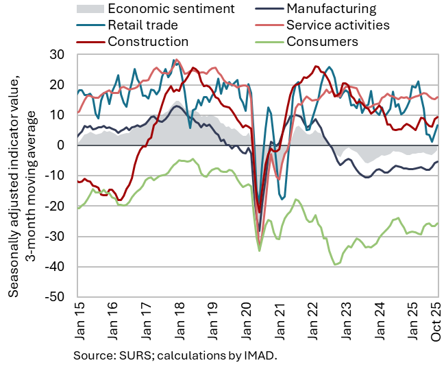 Economic sentiment indicators at the beginning of the fourth quarter suggest a continued strengthening of activity in the euro area. The composite Purchasing Managers’ Index (PMI) reached its highest level in two and a half years in October (52.5), with both components (manufacturing and services PMI) contributing to the improvement. The economic sentiment indicator (ESI) for the euro area also reached its highest level since mid-2023 in October, with confidence strengthening relative to September across all activities and among consumers. Compared to the same period last year, industrial confidence indicator improved markedly. In Germany, Slovenia’s most important economic partner, the composite PMI similarly climbed in October to a two-and-a-half-year high (53.9). In particular, the services PMI strengthened, and the manufacturing PMI, still largely supported by the capital goods sector, also remained above 50 (the threshold between expansion and contraction). The Ifo Business Climate Index for Germany likewise improved, driven mainly by firms’ more optimistic expectations regarding business conditions in the coming months, especially in industry.