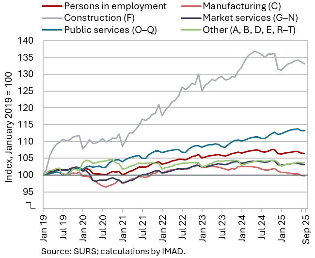The number of persons in employment remained similar in September to previous months (seasonally adjusted) and was 0.4% lower year-on-year. The number of employees declined year-on-year (–0.6%), while the number of self-employed increased (1.5%). The largest year-on-year decline in the number of persons in employment was recorded in administrative and support service activities (–4.3%), mainly due to a decrease in employment agencies, followed by manufacturing (–1.7%), and construction (–1.6%). Year-on-year growth in the number of persons in employment continued in public service activities, namely in human health and social work activities (up 3.5%) and in public administration (up 1.5%). The number of foreign citizens in employment increased by 1.7% year-on-year in September, while the number of Slovenian nationals in employment declined by 0.7%.