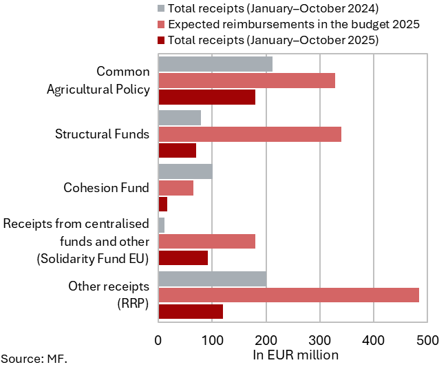 Slovenia’s net budgetary position against the EU budget was negative in the first ten months of 2025 (at EUR 108.9 million). In this period, Slovenia received EUR 480.4 million from the EU budget (34.4% of receipts envisaged in the adopted state budget for 2025) and paid EUR 589.3 million into it (80.6% of planned annual payments). The bulk of receipts were resources from the EU budget for the implementation of the Common Agricultural and Fisheries Policy (37.6% of all reimbursements to the state budget, 55.0% of the planned reimbursements in 2025) and for the Recovery and Resilience Plan (25.0% of all reimbursements to the state budget). Reimbursements from the structural funds amounted to 14.7% of all reimbursements (20.8% of the planned reimbursements in 2025). In October 2025, the European Commission gave a preliminary positive assessment to the fourth request for payment of funds under the RRP. Slovenia is expected to receive payment of the request, amounting to just under EUR 440 million, before the end of this year. According to the Information on the Implementation of the RRP (October 2025), one more payment request is planned to be submitted to the European Commission this year, and two more in 2026 (all three with a total gross value of EUR 772.4 million).