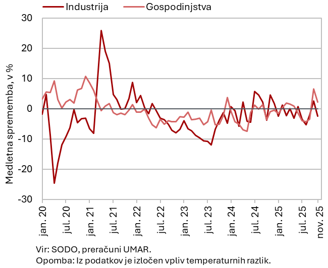 Novembrski podatki kažejo na medletno zmanjšanje porabe električne energije v industriji. Ob enakem številu delovnih dni je bila novembra za 2,4 % nižja kot pred letom. Poraba gospodinjstev pa je bila medletno višja za 2,2 %.