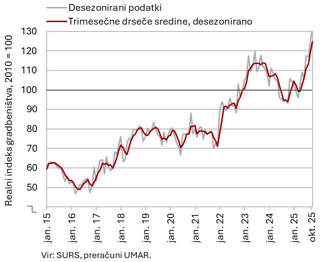 Vrednost gradbenih del se je oktobra nadalje močno okrepila. Po znižanju v prvem četrtletju se je gradbena aktivnost v nadaljevanju leta okrepila. Oktobra se je tekoče nadalje povečala za 6 % in bila za 36 % višja kot oktobra lani. Skupno je bila vrednost del v prvih desetih mesecih za 10 % višja kot v primerljivem obdobju lani. Višje so bile vrednosti vseh vrst gradbenih del, zlasti v gradnji nestanovanjskih stavb (16 %) in specializiranih gradbenih delih (15 %), rast je bila višja tudi v gradnji inženirskih objektov (7 %), v gradnji stanovanjskih stavb pa je ostala skromna (1 %).