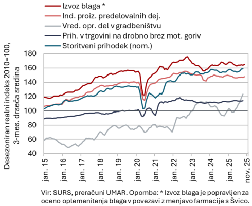 Slovenski izvoz blaga je bil v enajstih mesecih leta 2025 nekoliko manjši kot leto prej, aktivnost v gradbeništvu in potrošnja gospodinjstev pa sta se v desetih mesecih povečali. Realni izvoz blaga se je novembra tekoče povečal drugi mesec zapored, uvoz pa zmanjšal. V enajstih mesecih leta 2025 je bil izvoz blaga za 0,2 % manjši kot v enakem obdobju leto prej, uvoz pa večji za 1,6 %. Na upad izvoza je vplival predvsem manjši izvoz vozil ter drugih strojev in naprav, pa tudi železa in jekla ter nekaterih drugih materialov (izdelki iz kavčuka, mineralni proizvodi, papir). Proizvodnja predelovalnih dejavnosti se je novembra tekoče nekoliko okrepila. V enajstih mesecih je ostala medletno manjša; med večjimi dejavnostmi je bil medletni upad največji v proizvodnji vozil in plovil ter kovinski industriji. Rast vrednosti opravljenih gradbenih del se je po upadu v prvem četrtletju lani od drugega četrtletja močno okrepila, v desetih mesecih je bila medletno večja za desetino. Realni prihodek v večini trgovinskih panog se je po zmanjšanju v tretjem četrtletju oktobra povečal, prodaja v vseh trgovinskih panogah je bila v desetih mesecih lani medletno večja. Realni prihodek tržnih storitev se je po močni rasti v tretjem četrtletju oktobra močno zmanjšal, v desetih mesecih pa je bil medletno manjši le v drugih poslovnih dejavnostih.