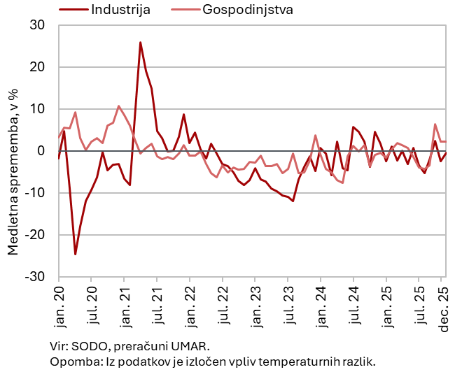 Decembrski podatki kažejo na medletno nižjo porabo električne energije v industriji. Ta je bila kljub dodatnemu delovnemu dnevu za 0,4 % nižja kot decembra 2024. Poraba gospodinjstev je bila medletno višja za 2,2 %.