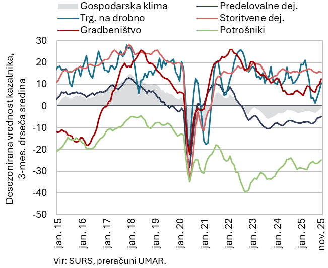 Vrednost kazalnika gospodarske klime se je novembra peti mesec zapored izboljšala, višja je bila tudi medletno. Vrednosti kazalnikov zaupanja potrošnikov in v gradbeništvu sta se tekoče povečali, kazalnik zaupanja v predelovalnih dejavnostih je stagniral, kazalnika v trgovini na drobno in storitvenih dejavnostih pa sta se nekoliko znižala. Enako velja za medletno primerjavo. Vrednost kazalnika gospodarske klime je presegla dolgoletno povprečje drugi mesec zapored (po skoraj treh letih), med dejavnostmi pa to povprečje presegata le vrednosti kazalnikov zaupanja v gradbeništvu in v storitvenih dejavnostih.