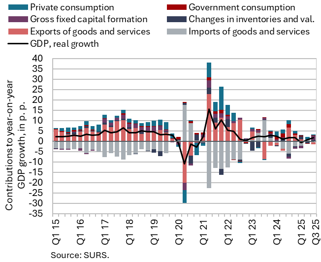 Economic growth continued in the third quarter of this year. GDP rose by 0.8% quarter-on-quarter (seasonally adjusted) and by 1.7% year-on-year. Year-on-year growth in private consumption eased slightly (1%), yet it remained an important driver of this year’s growth. Gross fixed capital formation increased markedly year-on-year (9.1%) after contracting in the first half of the year. Investment in infrastructure and non-residential buildings increased substantially, while investment in residential buildings remained lower than a year ago. Following a decline in the previous quarter, general government consumption rose by 1.2% year-on-year, primarily due to the fading impact of last year’s elevated base associated with post-flood reconstruction expenditures. With exports declining year-on-year (–1.1%) and imports rising (0.7%), external trade balance made a negative contribution to GDP growth (–1.4 p.p). The contribution of inventories, which had been revised sharply downward for the first half of the year, turned positive in the third quarter (0.6 p.p.). In the first nine months, GDP was up 0.7% year-on-year.