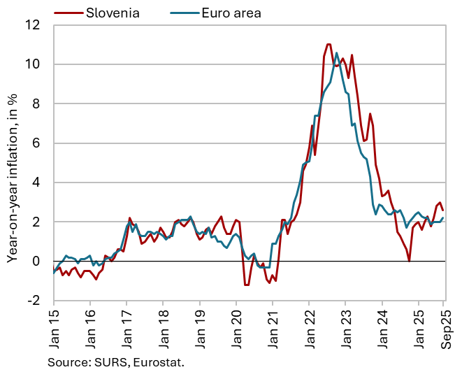 Year-on-year growth in consumer prices eased slightly in August, to 2.6%. Following a modest decline in clothing and footwear prices in August, prices in this group rose again in September (by 8.5%), though their year-on-year growth rate more than halved (to 3%). This contributed to a lower year-on-year increase in semi-durable goods prices (2% compared with 5.2% in August). Price growth in durable goods remained moderate (0.4%). Year-on-year growth in food and non-alcoholic beverage prices also slowed somewhat in September, yet remained the highest among all goods and services groups, at 7%, contributing 1.3 p.p. to the overall 2.6% year-on-year inflation rate. Year-on-year growth in service prices stood at 2.8% and has fluctuated around 3% since the beginning of the year. Year-on-year inflation, measured by the HICP, stood at 2.7% in September, 0.5 p.p. higher than in the euro area. Preliminary data indicate that much of this difference continues to stem from significantly higher growth in food, alcohol, and tobacco prices (Slovenia 6.2%, euro area 3%).