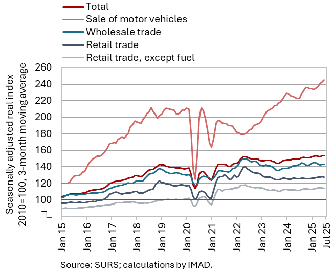 Despite weaker performance in most sectors in July, turnover in trade remained higher year-on-year across all sectors in the first seven months of the year. Wholesale turnover declined further in July after contracting in the second quarter and, for the first time this year, was lower year-on-year. Turnover also decreased year-on-year in retail trade with food products, which fell slightly in July following weak growth in the second quarter. Turnover from retail trade with non-food products stagnated after recording growth in the first two quarters, while turnover from the sale of motor vehicles increased sharply. Sales across all trade sectors were higher year-on-year in the first seven months. Growth was strong in the sales of motor vehicles (7%) and modest in other trade sectors (on average slightly above 1%).