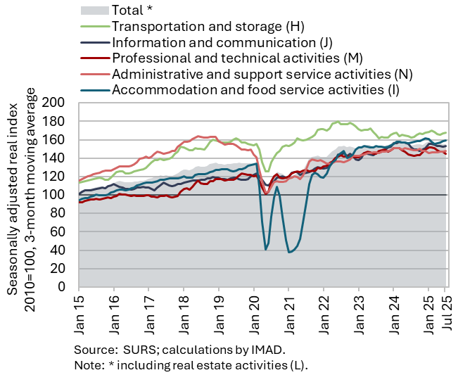 Total real turnover in market services declined further in July (by 1%, seasonally adjusted) after contracting in the second quarter and remained unchanged year-on-year. The sharpest decline was recorded in professional and technical activities (following a marked downturn in the second quarter), mainly due to a stronger contraction in architectural and engineering services and consultancy services. Turnover also decreased in accommodation and food service activities, after having increased in the second quarter. In transportation and storage, turnover declined slightly in July after falling in the previous quarter, with the largest drop in storage activities. Administrative and support service activities also recorded a decline (after growth in the second quarter). The only increase was recorded in information and communication (continuing the growth seen in the first half of the year), with stronger growth stemming from higher sales of services both in the domestic market (computer services) and abroad (telecommunications). In the first seven months of 2025, real turnover was higher year-on-year only in transportation and storage and in professional and technical activities.