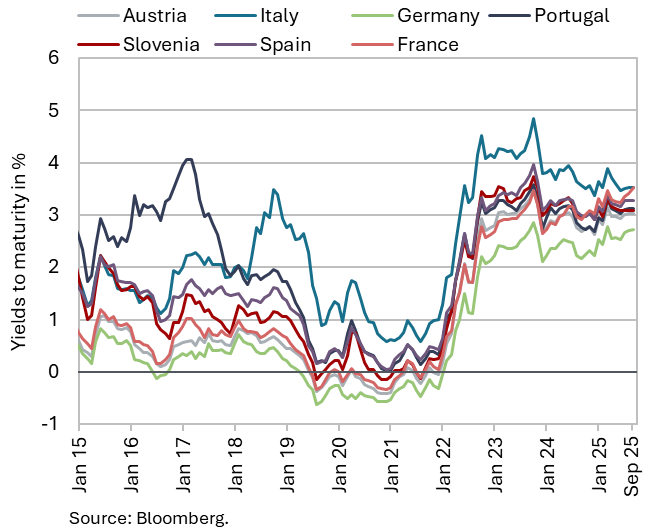 Year-on-year inflation eased slightly in September (2.6%), mainly due to slower growth in clothing and footwear prices. The largest contribution to inflation continued to come from higher prices of food and non-alcoholic beverages (7%). Goods exports and imports (excluding operations involving processing) declined month-on-month in August after real growth in July and were also lower year-on-year. On average, in the first eight months of the year, exports were lower year-on-year, while imports remained broadly unchanged compared with the same period last year. Despite weaker performance in most sectors in July, turnover in trade remained higher year-on-year across all sectors in the first seven months of the year. Total real turnover in market services declined further in July after contracting in the second quarter and was roughly at the same level as in July last year. In the first seven months, year-on-year growth in turnover was recorded only in transportation and storage as well as in professional and technical activities. According to seasonally adjusted data, the number of registered unemployed persons increased for the third consecutive month in September (by 0.5%), mainly due to a higher inflow of persons with temporary protection status into the unemployment register. The number of unemployed was also marginally higher year-on-year (by 0.2%). Yields to maturity on government bonds of core euro area countries rose in the third quarter amid heightened economic uncertainty and expectations of higher public expenditure on infrastructure and defence, while the yield to maturity on Slovenian government bonds declined.
