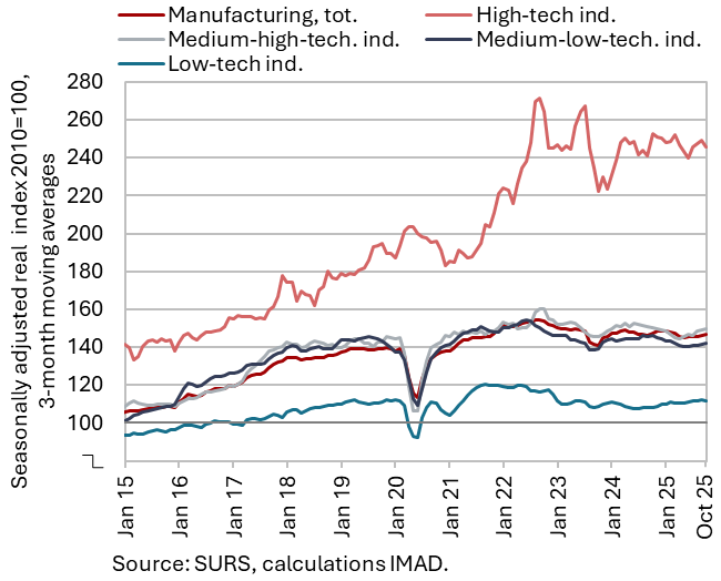 Manufacturing output remained unchanged month-on-month in October, while it again increased in high-technology and medium-low-technology industries. In the first ten months, manufacturing output was 1.1% lower year-on-year. In October, expectations regarding future production in manufacturing continued to improve, while the volume of new orders remained subdued.