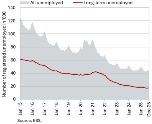 In December 2025, the number of unemployed persons (seasonally adjusted) remained broadly unchanged on a month-on-month basis (-0.1%). According to original data, 47,177 people were unemployed at the end of December, representing a 3% increase compared with the end of November. This increase largely reflects seasonal factors, notably a higher inflow into unemployment following the expiry of fixed-term employment contracts. On a year-on-year basis, unemployment increased slightly (by 0.3%). The year-on-year declines in long-term unemployment (–5.6%) and in unemployment among persons aged 50 and over (– 5.3%) were somewhat smaller than in previous months. The number of unemployed young persons (15–29 years) has been higher year-on-year since the end of 2024 (in December, there were 10,944 unemployed young people, representing a 9.4% year-on-year increase).