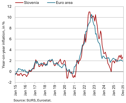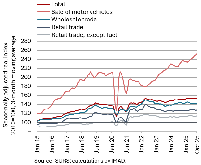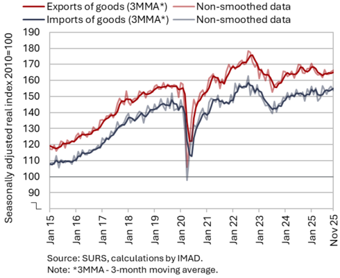 Slovenian goods exports in the first eleven months of 2025 were slightly lower than a year earlier, while activity in construction and household consumption increased over the first ten months. Real goods exports increased month-on-month in November for the second consecutive month, while imports declined. In the first eleven months of 2025, goods exports were 0.2% lower than in the same period of 2024, while imports were 1.6% higher. The decline in exports was mainly driven by lower exports of vehicles and other machinery and equipment, as well as iron and steel and some other materials (rubber products, mineral products, paper). Manufacturing output increased slightly month-on-month in November. Over the first eleven months, it remained lower year-on-year; among major activities, the year-on-year decline was largest in the manufacture of motor vehicles, trailers, semi-trailers and other transport equipment and in the metal industry. Following a decline in the first quarter of 2025, growth in the value of construction put in place strengthened markedly from the second quarter onwards; over the first ten months it was one tenth higher year-on-year. Real turnover in most trade segments increased in October following a decline in the third quarter; over first ten months of 2025, sales in all trade segments increased year-on-year. Real turnover in market services declined sharply in October after strong growth in the third quarter; in the first ten months of 2025, it was lower year-on-year only in administrative and support service activities.