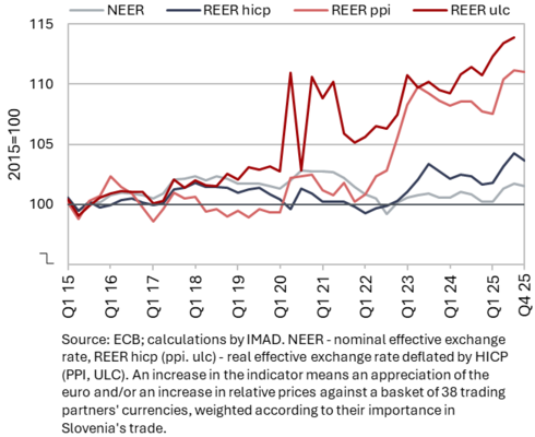 An already ongoing weakening of cost competitiveness was compounded in mid-2025 by a deterioration in price competitiveness indicators, which came to a halt towards the end of the year. Cost competitiveness (REER ulc) had been gradually deteriorating throughout most of 2024, mainly due to strong growth in (nominal) unit labour costs (NULC) in the construction sector. In the first three quarters of 2025, however, NULC growth across business sector activities was most pronounced in manufacturing and market services. Compared with the EU, Slovenia recorded particularly strong NULC growth in manufacturing, although it remained lower than in the Visegrad countries. Price competitiveness indicators (REER ppi, hicp), which had been gradually improving following the energy crisis, deteriorated in the second and third quarters of 2025, while their growth came to a halt in the fourth quarter. In addition to the depreciation of the euro (a decline in the NEER), developments were also influenced by lower growth in consumer prices (HICP) in Slovenia compared with its trading partners (while PPI growth was similar).