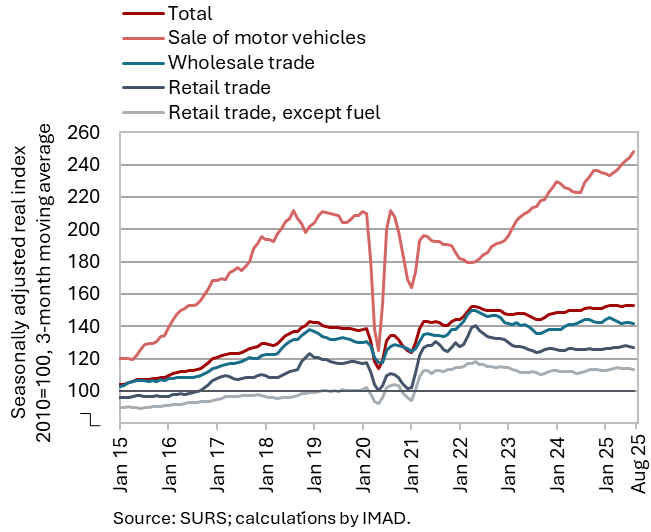 Turnover in trade was, on average, lower in July and August than in the second quarter (seasonally adjusted), except in motor vehicle sales. Turnover in wholesale trade, which had already declined in the second quarter, continued to fall in July and August and was lower year-on-year for the second consecutive period. Turnover in retail trade with food products also fell year-on-year, having decreased on average in July and August after weak growth in the second quarter. Turnover in retail trade with non-food products was, after growth in the first two quarters, slightly lower on average in July and August, but remained higher year-on-year. In the motor vehicles sales, turnover growth persisted through the summer months. Across all trade sectors, sales were higher year-on-year in the first eight months of the year. Growth in motor vehicles sales was robust (7%), while it was modest in other trade sectors (on average below 1%).