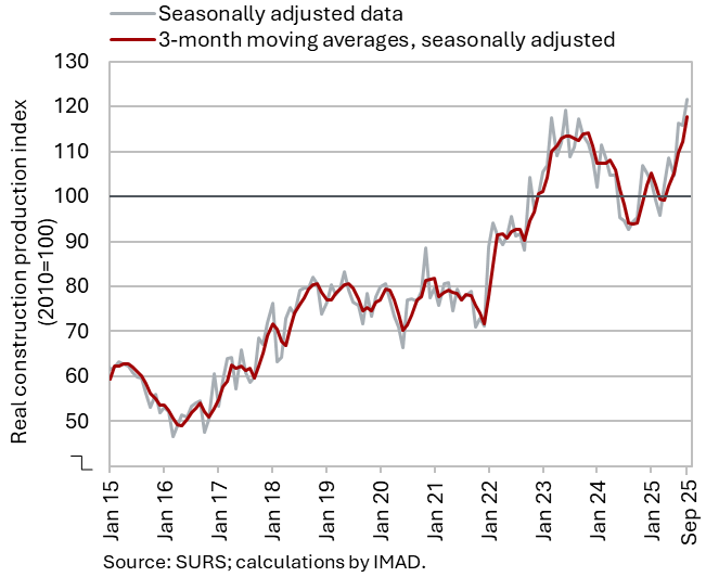 In September, the value of construction works continued to strengthen markedly. Following a decline in the first quarter, construction activity strengthened over the remainder of the year: in the second quarter by 6%, and in the third by as much as 12% (all seasonally adjusted). In the first nine months of the year, the total value of construction put in place was 7% higher than in the same period last year. The largest increase was recorded in the construction of non-residential buildings and specialised construction activities (12%). Activity was also higher in civil engineering (2%), while it was lower in the construction of residential buildings (–2%).