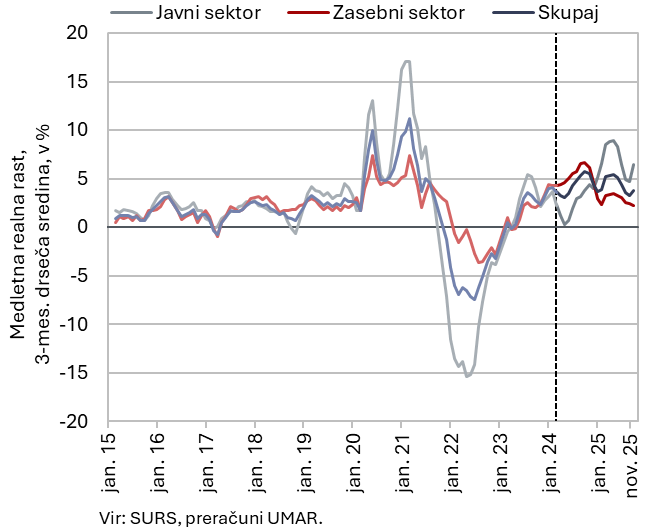 Medletna nominalna rast povprečne bruto plače je bila oktobra (7,7 %) višja kot v predhodnih mesecih, kar je predvsem posledica okrepljene rasti v javnem sektorju. V slednjem je bila oktobra nominalna plača medletno višja za 12,1 %. Okrepitev v primerjavi s predhodnimi meseci je posledica izplačila dogovorjenega drugega obroka zvišanja osnovnih plač. Tudi v zasebnem sektorju ostaja rast, ob precejšnjem pomanjkanju delovne sile, razmeroma visoka (5,2 %).