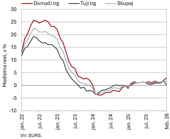 Cene industrijskih proizvodov slovenskih proizvajalcev so februarja na mesečni ravni ostale nespremenjene, njihova medletna rast pa se je upočasnila, predvsem na tujih trgih. Močan dvig minimalne plače je pospešil medletno nominalno rast povprečne bruto plače v januarju, predvsem v dejavnostih zasebnega sektorja z velikimi deleži prejemnikov minimalne plače. Število delovno aktivnih oseb po Statističnem registru delovno aktivnega prebivalstva (SRDAP) je tudi januarja stagniralo, vendar ob precejšnjih razlikah po dejavnostih. Največji medletni upad je bil v predelovalnih dejavnostih in trgovini, več pa je bilo delovno aktivnih v javnih storitvah, zlasti v zdravstvu ter socialnem varstvu. Presežek tekočega računa plačilne bilance je bil v zadnjih dvanajstih mesecih nižji kot v enakem predhodnem obdobju zaradi nižjega blagovnega salda in večjega primanjkljaja sekundarnih dohodkov.