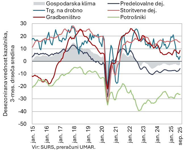 Razpoloženje v gospodarstvu se je septembra še izboljšalo, boljše je bilo tudi medletno, a še vedno nekoliko pod dolgoletnim povprečjem. K povečanju vrednosti kazalnika gospodarske klime, ki se je tretji mesec zapored povečala, je prispevalo izboljšanje zaupanja v skoraj vseh dejavnostih (razen storitvenih) in med potrošniki. Tudi medletno je bilo razpoloženje v storitvenih dejavnostih slabše, precej boljše pa v gradbeništvu ter tudi v predelovalnih dejavnostih in med potrošniki. V primerjavi z dolgoletnim povprečjem je razpoloženje ostalo nižje v predelovalnih dejavnostih, v trgovini na drobno in med potrošniki, višje pa je bilo v gradbeništvu ter pri storitvah.