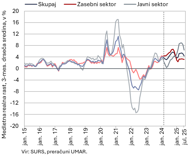 Medletna nominalna rast povprečne bruto plače je bila julija (5,8 %, realno 2,9 %) nižja kot v predhodnih mesecih. To je posledica nižje, a še vedno visoke rasti v javnem sektorju (6,1 %, realno 3,2 %), v zasebnem je rast ostala podobna (5,4 %, realno 2,6 %). V javnem sektorju se je po visoki rasti zaradi uveljavitve plačne reforme v začetku leta medletna rast v zadnjih dveh mesecih umirila. To je po naši oceni poleg višje lanske osnove (zaradi povišanja vrednosti plačnih razredov za del inflacije junija lani) tudi posledica umirjanja tekoče rasti nekaterih izplačil. V zasebnem sektorju na rast po naši oceni še naprej vpliva presežno povpraševanje po delovni sili v določenih delih gospodarstva. V prvih sedmih mesecih leta je bila skupna povprečna bruto plača nominalno višja za 7,0 % – v javnem sektorju za 9,9 %, v zasebnem pa za 5,3 %.