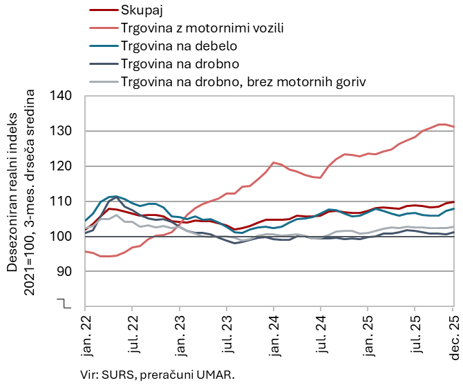 Realni prihodek v večini trgovinskih panog se je po zmanjšanju v tretjem četrtletju v zadnjem lanskem četrtletju povečal in bil tudi medletno večji. Po šibkejšem tretjem četrtletju sta se okrepili prodaja v trgovini na debelo in v trgovini na drobno z neživili ter dosegli najvišjo medletno rast v letu, zlasti zaradi visoke decembrske prodaje. Po upadu v predhodnem četrtletju se je povečal tudi prihodek v trgovini na drobno z živili, vendar je ostal nekoliko pod ravnjo izpred leta. Rast prihodka v trgovini z motornimi vozili se je ob koncu leta sicer precej umirila, a je medletno ostala zelo visoka. V letu 2025 je bila prodaja vseh panog večja kot leta 2024, najvišja je bila rast v trgovini z motornimi vozili (7,2 %), sledile so trgovina na drobno z neživili (2,9 %), trgovina na debelo (1,4 %) in trgovina na drobno z živili (0,4 %).