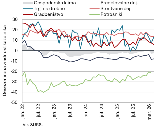 Kazalnik gospodarske klime se je marca po izrazitem februarskem poslabšanju v mesečni primerjavi nekoliko izboljšal. Po izboljševanju od septembra lani se je kazalnik februarja občutno poslabšal in prvič po avgustu 2025 zaostal za ravnjo izpred leta, pa tudi za dolgoletnim povprečjem. Marca se je na mesečni ravni znova nekoliko izboljšal, k čemur so prispevali kazalniki zaupanja v trgovini na drobno ter predelovalnih in storitvenih dejavnostih. Kazalnik zaupanja v gradbeništvu se je nadalje poslabšal, zaupanje potrošnikov pa je ostalo na ravni prejšnjega meseca. Razpoložeje v gospodarstvu je marca ostalo slabše kot pred letom, nižji so bili vsi kazalniki zaupanja, razen med potrošniki.