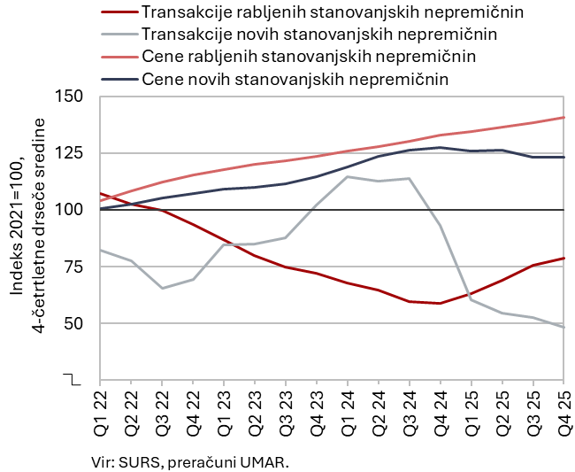 Rast cen stanovanjskih nepremičnin se je lani ob povečanem prometu umirila. V povprečju leta 2025 je bila 4,3-odstotna, po tem ko je bila v povprečju leta 2023 in 2024 okoli 7,5-odstotna. Cene rabljenih stanovanjskih nepremičnin, pri katerih se je število transakcij po najnižji ravni v letu 2024 povečalo za tretjino, so bile medletno višje za 5,8 % (leto prej za 7,4 %). Nižje kot pred letom pa so bile cene novih stanovanjskih nepremičnin (za 3,3 %, po rasti za dobro desetino v povprečju leta 2024), s katerimi pa je bilo opravljenih le 4 % vseh transakcij. Povprečne cene stanovanjskih nepremičnin so bile za 110,6 % višje kot leta 2014, ko so dosegle najnižjo raven; splošna rast cen (inflacija) je bila v tem obdobju 29,7-odstotna, rast povprečne neto plače blizu 60-odstotna.