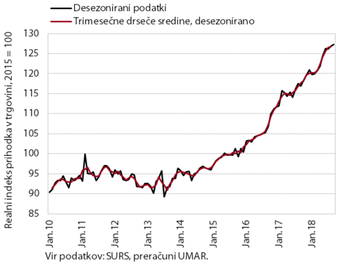 Prodaja v trgovini se je v tretjem četrtletju nadalje povečala in bila skupaj v prvih devetih mesecih medletno realno višja za 6,7 %. Najvišja je bila rast prodaje trajnih dobrin (predvsem motornih vozil in gospodinjskih naprav) in nekaterih poltrajnih proizvodov, nadaljevalo pa se je tudi živahno trgovanje z nekaterimi primarnimi proizvodi (zemeljski plin, električna energija). Medletno nižja je le prodaja živil, pijač in tobačnih izdelkov.