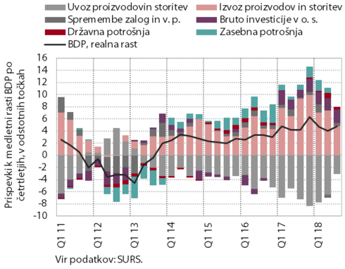 V tretjem četrtletju se je nadaljevala visoka in široko osnovana rast gospodarske aktivnosti. Ključna dejavnika rasti sta okrepljena investicijska aktivnost in ugodni izvozni rezultati, solidna je tudi rast državne potrošnje. Trošenje gospodinjstev pa se, kljub zelo ugodnim gibanjem na trgu dela, po podatkih Statističnega urada RS ni okrepilo. Rast BDP je tudi tokrat opazno presegla povprečno rast v EU.