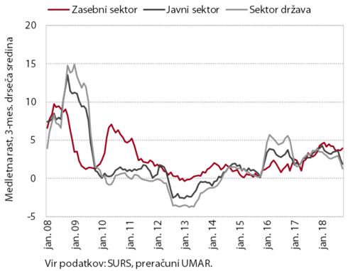 V prvih desetih mesecih je bila medletna rast plač višja kot v enakem obdobju lani. V zasebnem sektorju na višjo rast vplivajo ugodni poslovni rezultati podjetij, relativno nizka brezposelnost in postopna rast produktivnosti. V javnem sektorju je rast še vedno odraz sprejetih dogovorov s sindikati in rednih napredovanj konec preteklega leta.