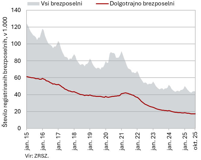 Število registriranih brezposelnih oseb se je oktobra nadalje malenkost povečalo (za 0,2 % desez.). Po originalnih podatkih je bilo konec oktobra brezposelnih 45.670 oseb oz. 3,9 % več kot konec septembra, a je to večinoma odraz sezonskih gibanj, povezanih z večjim prilivom prvih iskalcev zaposlitve v brezposelnost ob zaključku študijskega leta. Medletno jih je bilo za 0,5 % več, kar je večinoma odraz povečanega priliva iskalcev prve zaposlitve v brezposelnost, ki je od julija letos posledica večjega priliva tujih državljanov s statusom začasne zaščite v evidenco brezposelnih, delno pa tudi konjunkturnih gibanj. Medletni upad dolgotrajno brezposelnih