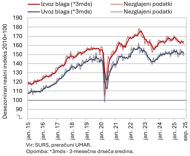 Realni izvoz blaga se je v tretjem četrtletju v primerjavi z drugim povečal, uvoz pa ostal na doseženi ravni (desez.); medletno sta bila oba nižja. K četrtletni rasti izvoza (0,5 %) je pomembno prispevalo opazno julijsko povečanje, avgusta in septembra pa je izvoz upadel. V tretjem četrtletju se je povečal izvoz v države EU, izven EU pa se je zmanjšal, zlasti v ZDA. Opazno se je povečal izvoz skupine cestnih vozil, ki sicer mesečno in četrtletno močno niha, zlasti izvoz v Francijo. Večji je bil tudi izvoz farmacevtskih proizvodov ter drugih strojev in naprav. Po opaznem upadu v predhodnem četrtletju se je nekoliko povečal tudi izvoz kovin in kovinskih izdelkov, zmanjšal pa izvoz ostalih materialov. Pri uvozu (0,1 %) sta se tekoče povečala uvoza proizvodov za široko in investicijsko potrošnjo, drugo četrtletje zapored pa se je zmanjšal uvoz proizvodov za vmesno potrošnjo (vse desez.). Medletno sta bila izvoz in uvoz v tretjem četrtletju manjša (–2,2 % oz. –0,3 %), kar je bilo delno povezano tudi z višjo lansko osnovo. V devetih mesecih letos je bil izvoz nižji za 0,4 %, uvoz pa višji za 0,7%.