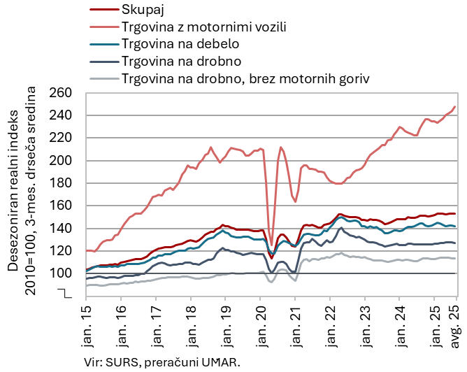 Prihodek v trgovinskih panogah je bil v povprečju julija in avgusta, razen pri prodaji motornih vozil, nižji kot v drugem četrtletju (desez.). V trgovini na debelo je po zmanjšanju v drugem četrtletju julija in avgusta še upadel in bil drugič zapored medletno manjši. Medletno manjši je bil tudi prihodek v trgovini na drobno z živili, ki se je po šibki rasti v drugem četrtletju v povprečju julija in avgusta zmanjšal. Prihodek v trgovini na drobno z neživili je bil po rasti v prvih dveh četrtletjih v povprečju julija in avgusta nekoliko manjši, a je ostal medletno večji. V trgovini z motornimi vozili pa se je rast prihodka nadaljevala tudi v poletnih mesecih. Prodaja v vseh trgovinskih panogah je bila v osmih mesecih medletno večja. V trgovini z motornimi vozili je bila rast visoka (7 %), v ostalih trgovinskih panogah pa skromna (v povprečju pod 1 %).