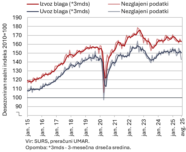 Blagovni izvoz in uvoz sta se avgusta tekoče zmanjšala in bila manjša kot pred letom; SURS je opazno znižal uvoz blaga v prvih sedmih mesecih, kar vpliva tudi na saldo blagovnih transakcij. Po julijski rasti se je realni izvoz avgusta tekoče zmanjšal za 2,0 %. Manjši je bil izvoz v države EU (zlasti Italijo) in tudi v države izven EU. Zmanjšal se je izvoz kovin in kovinskih izdelkov, strojev in naprav ter raznih gotovih izdelkov, še povečal pa se je izvoz farmacevtskih in drugih kemijskih proizvodov ter izvoz vozil. Uvoz se je zmanjšal drugi mesec zapored (–6,6 %), manjši je bil tako uvoz iz držav EU kot tudi izven. Opazneje se je zmanjšal uvoz proizvodov za široko potrošnjo (vse desez.).
