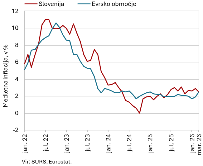 Medletna rast cen življenjskih potrebščin se je marca znižala na 2,5 %, predvsem zaradi učinka osnove pri cenah električne energije, ki so se lani marca precej povišale; podražitev naftnih derivatov v povezavi z naftno krizo v marčno inflacijo v veliki meri še ni zajeta. Število brezposelnih je bilo marca (desez.) podobno kot prejšnja dva meseca in nekoliko nižje kot ob koncu lanskega leta. Izvoz blaga se je po januarski rasti tudi februarja tekoče povečal, uvoz pa zmanjšal, oba sta bila v prvih dveh mesecih letos medletno še nižja. Skupni realni prihodek tržnih storitev se je po povečanju v zadnjem lanskem četrtletju januarja ohranil na decembrski ravni, medletno pa je ostal večji v vseh dejavnostih, razen prometu. Donosnost do dospetja slovenske državne obveznice se je v prvem četrtletju povišala, kot odziv na vojno na Bližnjem vzhodu in s tem povezane večje inflacijske pritiske.