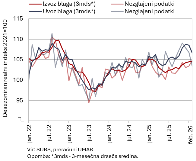 Izvoz blaga se je februarja tekoče povečal, uvoz blaga pa zmanjšal, oba sta bila v prvih dveh mesecih letos medletno nižja. Realni izvoz blaga se je februarja tekoče povečal drugi mesec zapored (+1,3 %). K rasti je prispeval predvsem večji izvoz blaga v države izven EU (Rusija, Združeno kraljestvo in ZDA), izvoz v glavne trgovinske partnerice v EU pa je bil tekoče manjši. Med proizvodi se je povečal izvoz farmacevtskih in kemičnih izdelkov, raznih izdelkov (znanstveni in kontrolni instrumenti ter razni gotovi izdelki) ter kovin in kovinskih izdelkov. Manjši je bil izvoz vozil, ki mesečno opazneje niha, ter drugih strojev in naprav, oboje pa je bilo povezano predvsem z manjšim izvozom v Nemčijo in Francijo. Realni uvoz se je februarja zmanjšal tretji mesec zapored (–3,2%), predvsem zaradi manjšega uvoza nekaterih energetskih surovin. Uvoz proizvodov za vmesno (brez uvoza naftnih derivatov in elektrike) in široko potrošnjo se je sicer povečal, uvoz proizvodov za investicijsko potrošnjo pa zmanjšal (vse desez.). V primerjavi z enakim obdobjem lani je bil v prvih dveh mesecih ob enem delovnem dnevu manj realni izvoz manjši za 1,8 %, uvoz pa za 1,6 %.