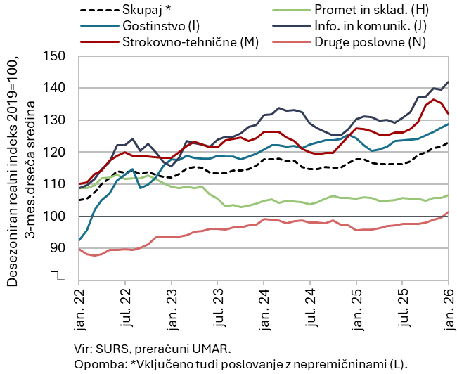 Skupni realni prihodek tržnih storitev se je po povečanju v zadnjem lanskem četrtletju januarja ohranil na decembrski ravni (desez.), medletno pa je ostal večji. V gostinstvu se prihodek krepi od lanske pomladi, v informacijsko-komunikacijskih dejavnostih pa od druge polovice lanskega leta. V strokovno-tehničnih dejavnostih se prihodek po nekajmesečnem zviševanju od zadnje četrtine lanskega leta zmanjšuje, predvsem v arhitekturno-projektantskih storitvah. V dejavnosti prometa in skladiščenja prihodek stagnira od konca leta 2024. V drugih poslovnih dejavnostih je prihodek januarja po postopnem povečevanju od začetka lanskega leta z vidnejšim povečanjem nekoliko presegel raven iz leta 2019 (vse desez.). Skupni realni prihodek je bil januarja medletno večji za 3,8 %, nekoliko manjši kot pred letom je bil le v dejavnosti prometa (za 1,3 %).